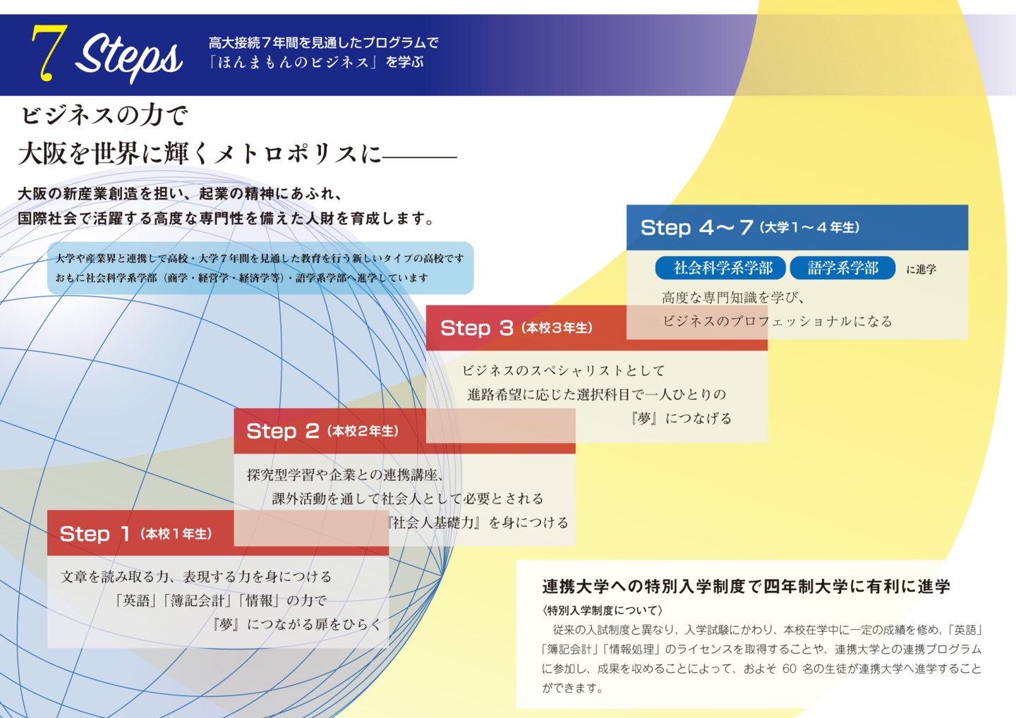 大阪ビジネスフロンティア高等学校は、大学や産業界と連携して高校・大学7年間を見通した「高大接続」教育を行う新しいタイプの高校です。