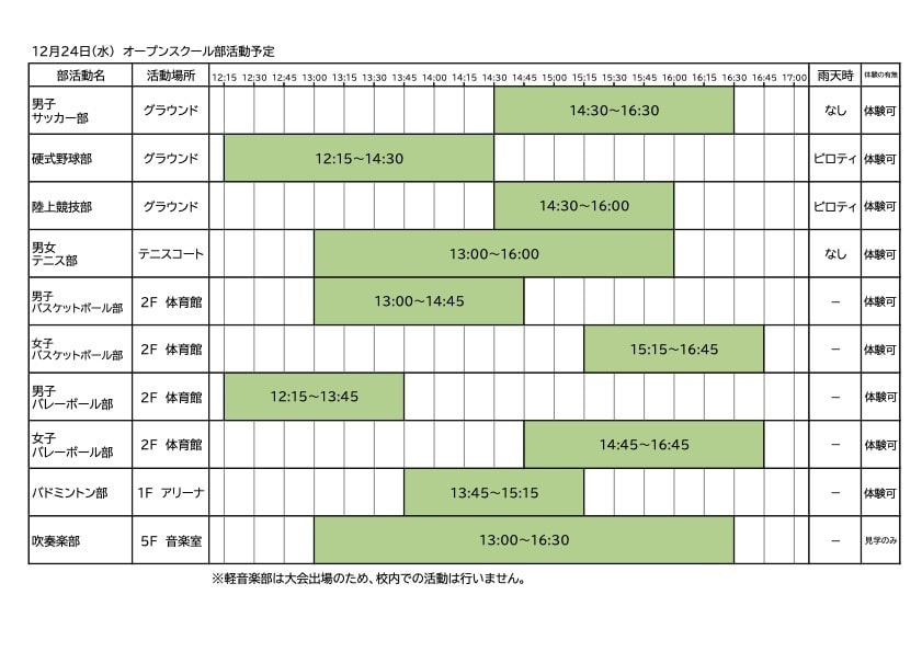 - オープンスクール当日の午前7時に大阪市に「特別警報」または「暴風(雪)警報」および地震に係る「警戒宣言」が発表中の場合は、中止といたします。