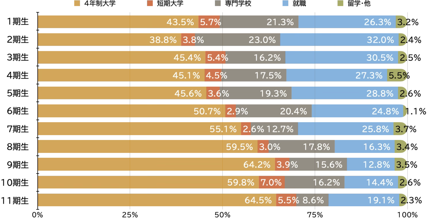 また、年を重ねるごとに生徒の進学への意識が高くなってきており、近年は半数以上の生徒が4年制大学に進学しています。